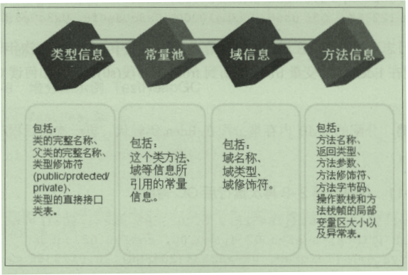 方法区主要保存的信息是类的元数据。方法区与堆空间类似,它也是被JVM中所有的线程共享的区域。如下图所示,方法区中最为重要的是类的类型信息、常量池、域信息、方法信息。类型信息包括类的完整名称、父类的完整名称、类型修饰符(public/protected/private)和类型的直接接口类表。