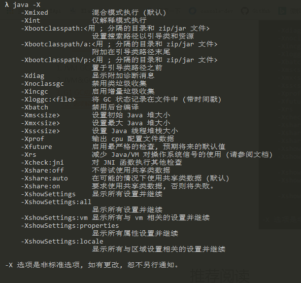 和诊断选项一样,也可以和-XX:+PrintFlagsFinal选项联合使用,即-XX:+PrintFlagsFinal和-XX:+UnlockExperimental VMOptions这两个选项联合使用时可以输出日志,输出的日志已经包含在了前一个选项-XX:+UnlockDiagnosticVMOptions的运行输出里,这里就不再重复。