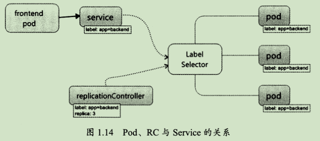 从图1.14中我们看到,Kubernetes的 Service定义了一个服务的访问入口地址,前端的应用(Pod)通过这个入口地址访问其背后的一组由Pod副本组成的集群实例,Service与其后端Pod副本集群之间则是通过Label selector来实现“无缝对接”的。而RC的作用实际上是保证Service的服务能力和服务质量始终处于预期的标准。