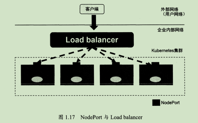 但NodePort还没有完全解决外部访问Service的所有问题,比如负载均衡问题,假如我们的集群中有10个Node,则此时最好有一个负载均衡器,外部的请求只需访问此负载均衡器的IP地址,由负载均衡器负责转发流量到后面某个Node的NodePort上。如图1.17所示。
