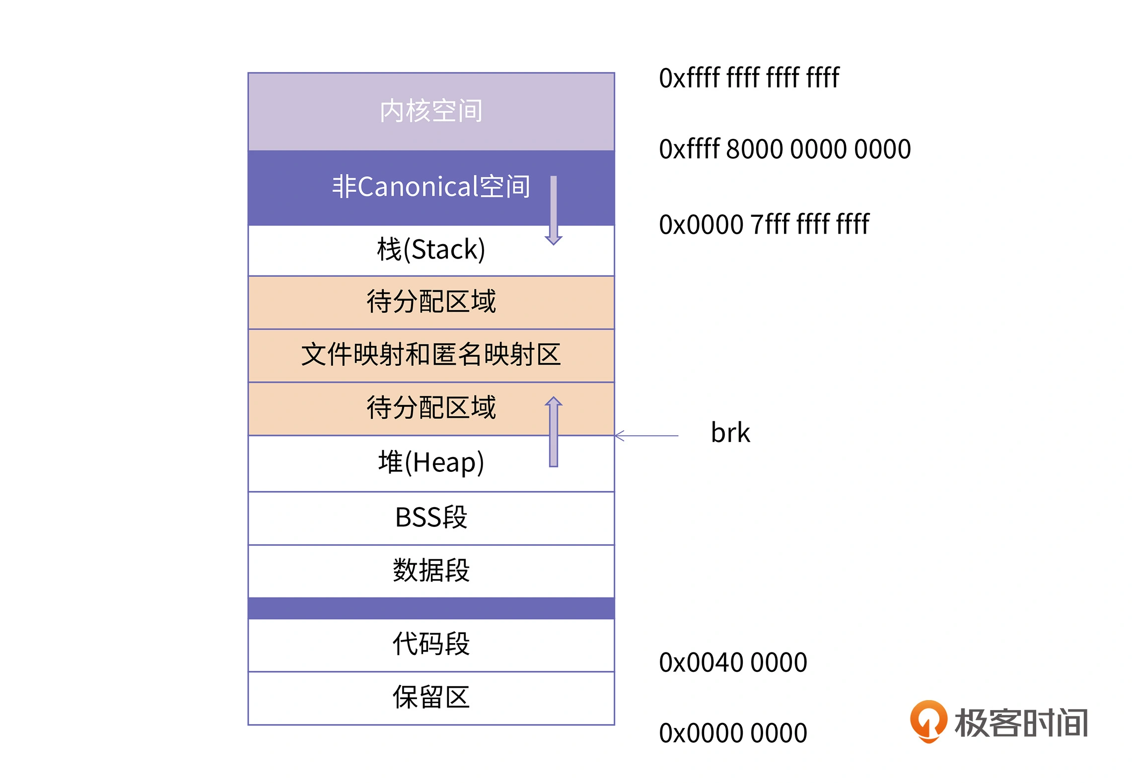 从图中你可以看到,在用户空间和内核空间之间有一个巨大的内存空洞。这块空间之所以用更深颜色来区分,是因为这块空间的不可访问是由CPU来保证的(这里的地址都不满足Intel 64的Canonical form)。