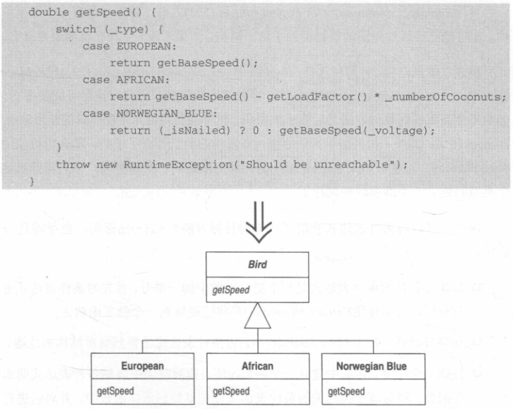 大多数时候,一看到switch语句,你就应该考虑以多态来替换它。问题是多态该出现在哪儿?switch语句常常根据类型码进行选择,你要的是”与该类型码相关的函数或类”,所以应该使用Extract Method将switch语句提炼到一个独立函数中,再以Move Method将它搬移到需要多态性的那个类里。此时你必须决定是否使用Replace Type Code with Subclasses或Replace Type Code with State/Strategy 。一旦这样完成继承结构之后,你就可以运用Replace Conditional with Polymorphism了。