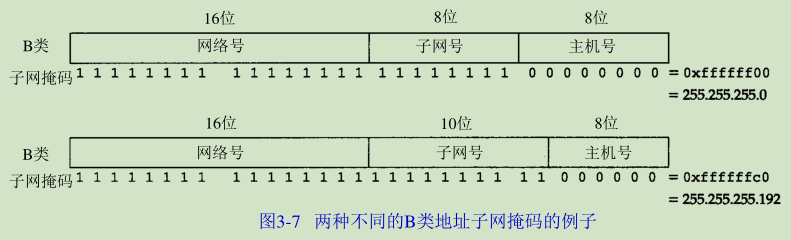 现在所有的主机都要求支持子网编址(RFC 950 [Mogul and Postel 1985])。不是把IP地址看成由单纯的一个网络号和一个主机号组成,而是把主机号再分成一个子网号和一个主机号。
