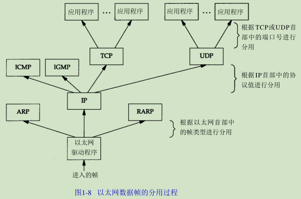 当目的主机收到一个以太网数据帧时,数据就开始从协议栈中由底向上升,同时去掉各层协议加上的报文首部。每层协议盒都要去检查报文首部中的协议标识,以确定接收数据的上层协议。这个过程称作分用(Demultiplexing),图1-8显示了该过程是如何发生的。