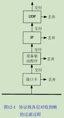 如果网卡收到一个帧,这个帧将被传送给设备驱动程序(如果帧检验和错,网卡将丢弃该帧)。设备驱动程序将进行另外的帧过滤。首先,帧类型中必须指定要使用的协议(IP、ARP等等)。其次,进行多播过滤来检测该主机是否属于多播地址说明的多播组。设备驱动程序随后将数据帧传送给下一层,比如,当帧类型指定为IP数据报时,就传往IP层。IP根据IP地址中的源地址和目的地址进行更多的过滤检测。如果正常,就将数据报传送给下一层(如TCP或UDP)。