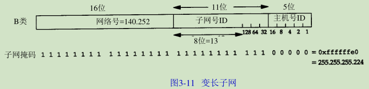 将来或许会有更多的主机和网络,但是为了不让主机跨越不同的网络就得使用不同的子网号。我们的解决方法是把子网号从8 bit扩充到11 bit,把主机号从8 bit减为5 bit。这就叫作变长子网,因为140.252网络中的大多数子网都采用8 bit子网掩码,而我们的子网却采用11 bit的子网掩码。