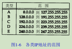 区分各类地址的最简单方法是看它的第一个十进制整数。图1-6列出了各类地址的起止范围,其中第一个十进制整数用加黑字体表示。
