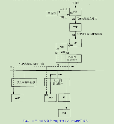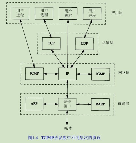 从图1-4中可以看出,在TCP/IP协议族中,链路层主要有三个目的:(1)为IP模块发送和接收IP数据报;(2)为ARP模块发送ARP请求和接收ARP应答;(3)为RARP发送RARP请求和接收RARP应答。