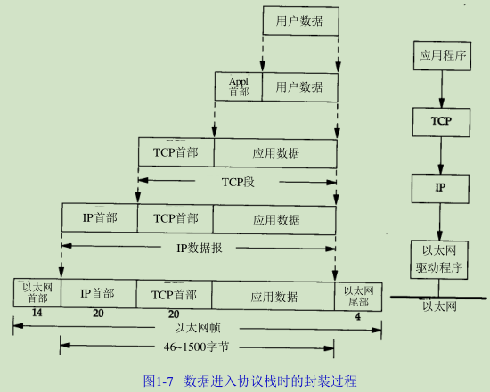 当应用程序用TCP传送数据时,数据被送入协议栈中,然后逐个通过每一层直到被当作一串比特流送入网络。其中每一层对收到的数据都要增加一些首部信息(有时还要增加尾部信息),该过程如图1-7所示。TCP传给IP的数据单元称作TCP报文段或简称为TCP段(TCP segment)。IP传给网络接口层的数据单元称作IP数据报(IP datagram)。通过以太网传输的比特流称作帧(Frame)。