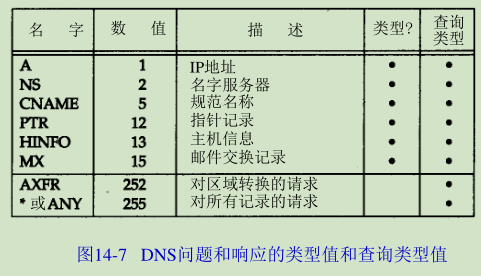 每个问题有一个查询类型,而每个响应(也称一个资源记录,我们下面将谈到)也有一个类型。大约有20个不同的类型值,其中的一些目前已经过时。图14-7显示了其中的一些值。查询类型是类型的一个超集(superset):图中显示的类型值中只有两个能用于查询类型。
