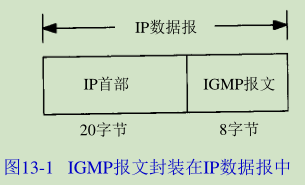 正如ICMP一样,IGMP也被当作IP层的一部分。IGMP报文通过IP数据报进行传输。不像我们已经见到的其他协议,IGMP有固定的报文长度,没有可选数据。图13-1显示了IGMP报文如何封装在IP数据报中。