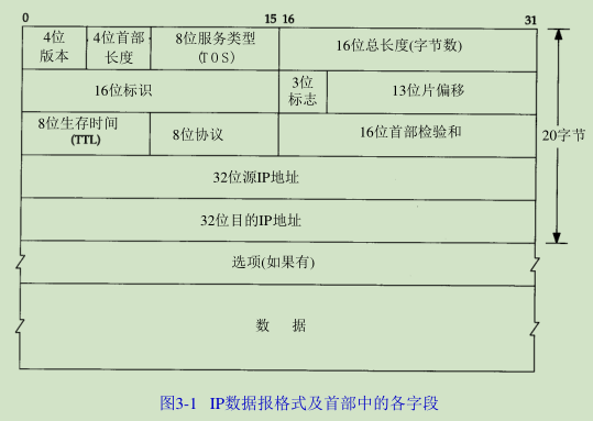 IP数据报的格式如图3-1所示。普通的IP首部长为20个字节,除非含有选项字段。