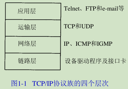 网络协议通常分不同层次进行开发,每一层分别负责不同的通信功能。一个协议族,比如TCP/IP,是一组不同层次上的多个协议的组合。TCP/IP通常被认为是一个四层协议系统,如图1-1所示。