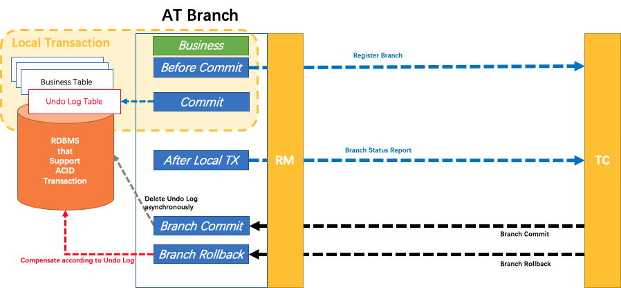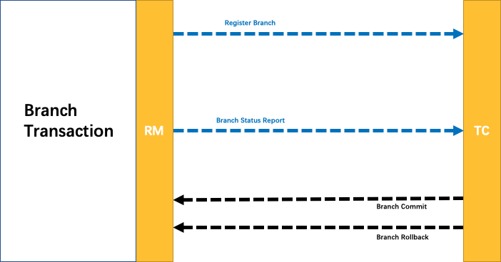 - RM 向 TC 注册分支事务,将其纳入 XID 对应全局事务的管辖。
