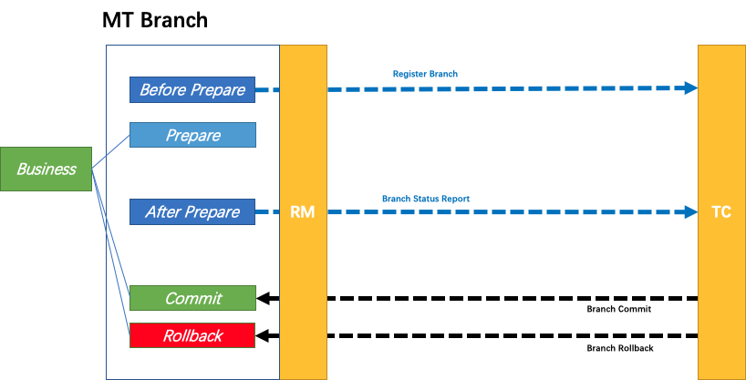 业务逻辑需要被分解为 Prepare/Commit/Rollback 3 部分,形成一个 MT 分支,加入全局事务。