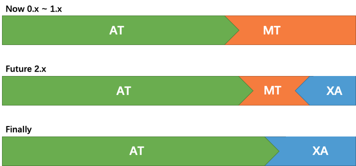 回到我们设计的初衷:一个理想的分布式事务解决方案是不应该侵入业务的。MT 模式是在 AT 模式暂时不能完全覆盖所有场景的情况下,一个比较自然的补充方案。我们希望通过 AT 模式的不断演进增强,逐步扩大所支持的场景,MT 模式逐步收敛。未来,我们会纳入对 XA 的原生支持,用 XA 这种无侵入的方式来覆盖 AT 模式无法触达的场景。