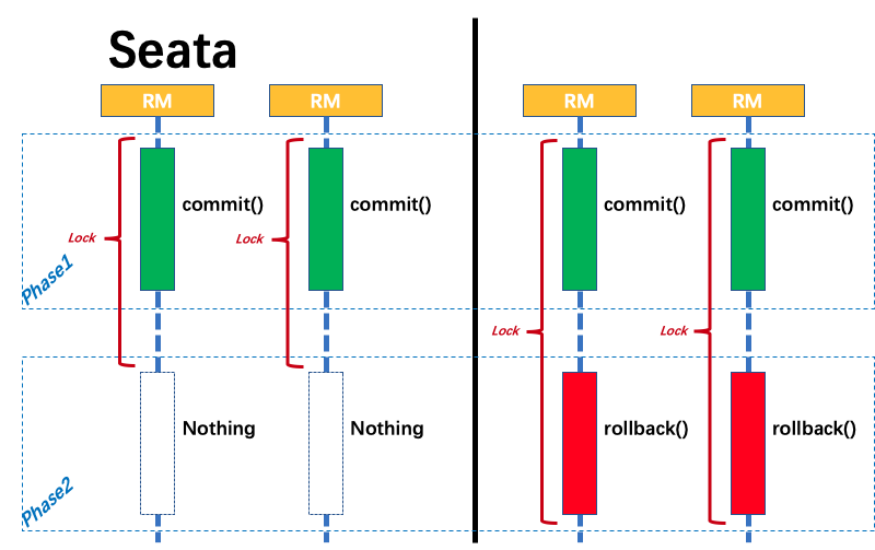 - 分支事务中数据的 全局锁 在事务协调器侧管理,在决议 Phase2 全局提交时,全局锁马上可以释放。只有在决议全局回滚的情况下,全局锁 才被持有至分支的 Phase2 结束。