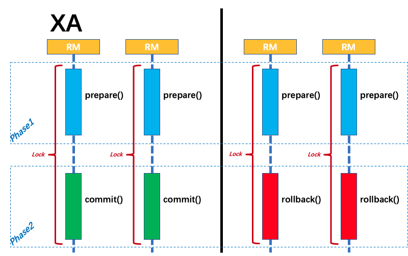 XA 方案的 RM 实际上是在数据库层,RM 本质上就是数据库自身(通过提供支持 XA 的驱动程序来供应用使用)。