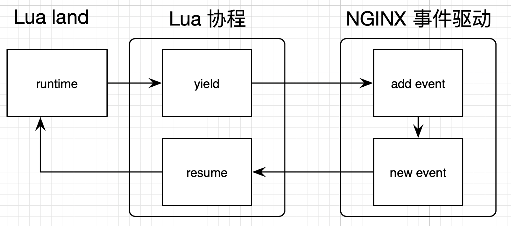 在OpenResty层面,Lua的协程会与Nginx的事件机制相互配合。如果Lua代码中出现类似查询 MySQL 数据库这样的 I/O 操作,就会先调用Lua协程的 yield 把自己挂起,然后在Nginx中注册回调;在 I/O 操作完成(也可能是超时或者出错)后,再由Nginx回调 resume 来唤醒Lua协程。这样就完成了Lua协程和Nginx事件驱动的配合,避免在Lua代码中写回调。