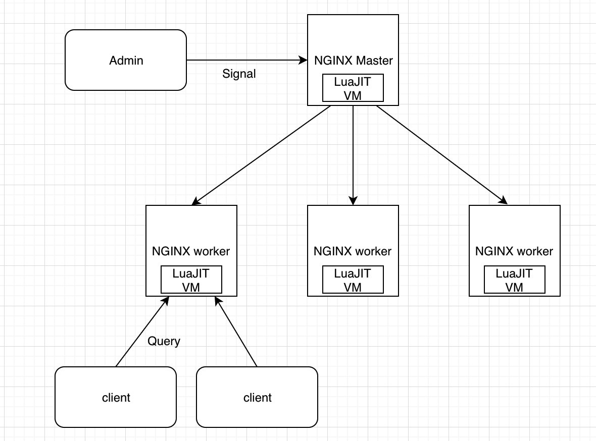OpenResty的worker进程都是fork master进程而得到的,其实,master进程中的LuaJIT虚拟机也会一起fork过来。在同一个worker内的所有协程,都会共享这个LuaJIT虚拟机,Lua代码的执行也是在这个虚拟机中完成的。