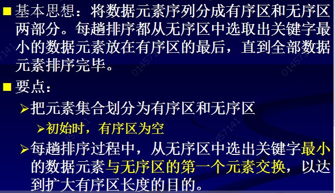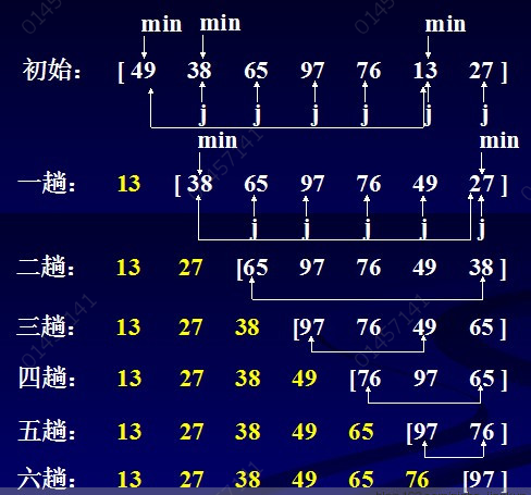 private static void SelectSort(int[] myArray) { int i, j, smallest; //数据起始位置,从0到倒数第二个数据 for (i = 0; i < myArray.Length - 1; i++) { smallest = i;//记录最小数据的下标 for (j = i + 1; j < myArray.Length; j++) { //在剩下的数据中寻找最小数据 if (myArray[j] < myArray[smallest]) { smallest = j;//如果有比它更小的,记录下标 } } //将最小数据和未排序的第一个数据交换 Swap(ref myArray[i], ref myArray[smallest]); } }