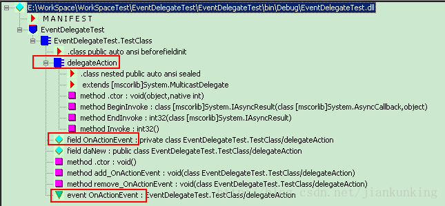 public event delegateAction OnActionEvent;在IL中不仅仅对应event OnActionEvent而且还对应一个field OnActionEvent;而field OnActionEvent与 public delegateAction daNew生成的field daNew是一样的.