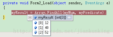 上例中说明了Predicate的使用,FindAll方法中,参数2即是一个Predicate,在具体的执行中,每一个数组的元素都会执行指定的方法,如果满足要求返回true,并会被存放在结果集中,不符合的则被剔除,最终返回的集合,即是结果判断后想要的集合。