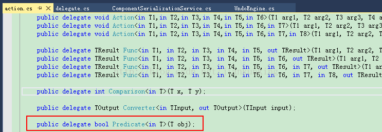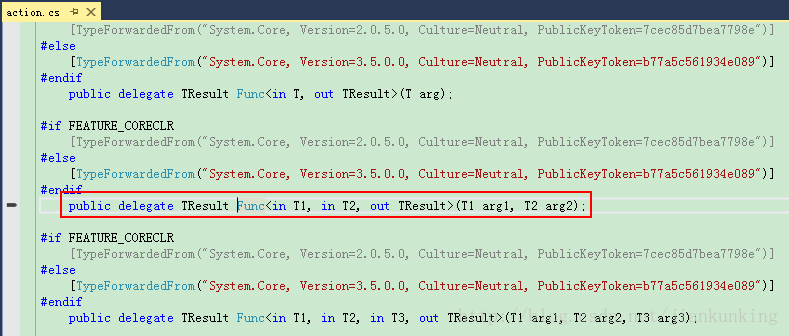 Action 与Func:这两个其实说白了就是系统定义好的Delegate,他有很多重载的方法,便于各种应用情况下的调用。他在系统的System命名空间下,因此全局可见。