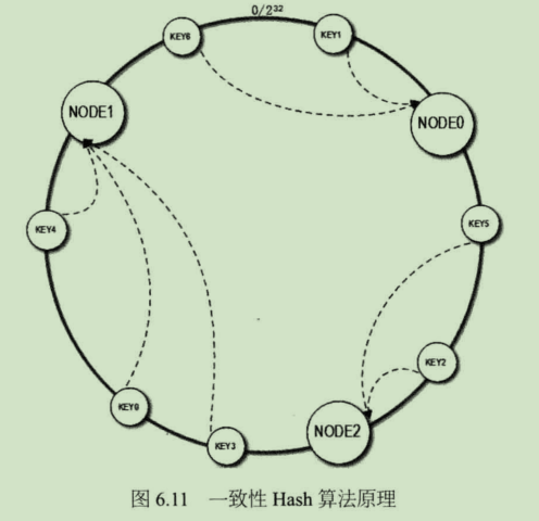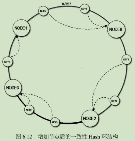 图6.12中,加入新节点NODE3后,原来的KEY大部分还能继续计算到原来的节点。只有KEY3、KEY0从原来的NODE1重新计算到NODE3。这样就能保证大部分被缓存的数据还可以继续命中。3台服务器扩容至4台服务器。可以继续命中原有缓存数据的概率是75%,远高于余数Hash的25%。而且随着集群规模越大。继续命中原有缓存数据的槪率也逐渐增大,100台服务器扩容增加1台服务器。继续命中的槪率是99%,虽然仍有小部分数据缓存在服务器中不能被读到,但是这个比例足够小。通过访问数据库获取也不会对数据库造成致命的负载压力。