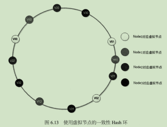 在图6.13中,新加入节点NODE3对应的一组虚拟节点为V30,V31,V32,加入到 —致性Hash环上后,影响V01, V12, V22三个虚拟节点,而这三个虚拟节点分别对应 NODE0 NODE1, NODE2三个物理节点。最终集群中加入一个节点,但是同时影响到集群中已存在的三个物理节点,在理想情况下,每个物理节点受影响的数据量 为其节点缓存数据最的1/4(X/(N+X)),N为原有物理节点数,X为新加入物理节点数),也就是集群中已经被缓存的数据有75%可以被继续命中,和未使用虚拟节点的一致性Hash算法结果相同,只是解决的负载均衡的问题。
