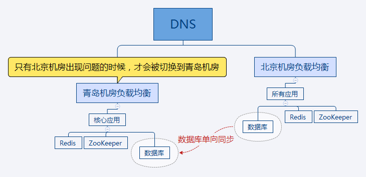 - 北京机房非故障期间,青岛机房的机器,仅做数据库同步,存在一定的资源浪费。