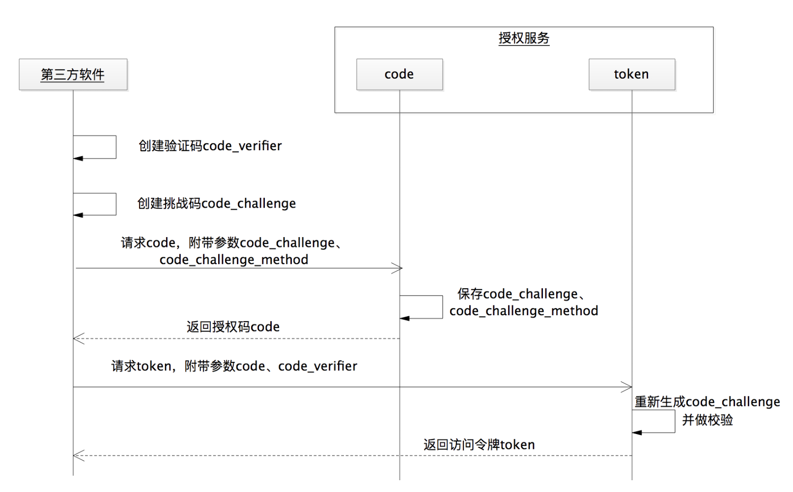 注意,为了突出第三方软件使用 PKCE 协议时与授权服务之间的通信过程,省略了受保护资源服务和资源拥有者的角色: