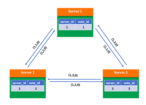 第一步:当系统刚启动时,3 个服务器当前投票均为第一轮投票,即 epoch=1,且 zxID 均为 0。此时每个服务器都推选自己,并将选票信息 <epoch, vote_id, vote_zxID> 广播出去。