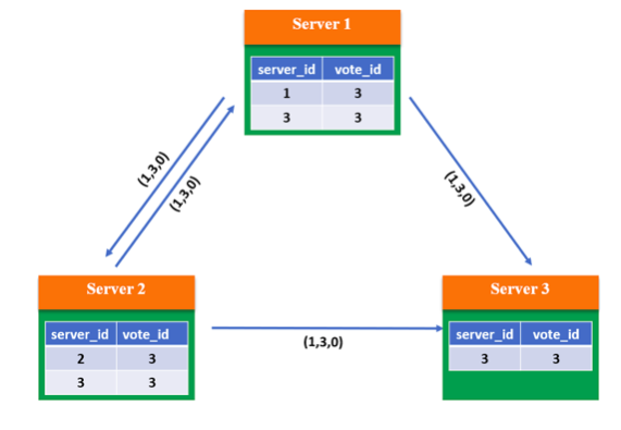 第二步:根据判断规则,由于 3 个 Server 的 epoch、zxID 都相同,因此比较 server_id,较大者即为推选对象,因此 Server 1 和 Server 2 将 vote_id 改为 3,更新自己的投票箱并重新广播自己的投票。