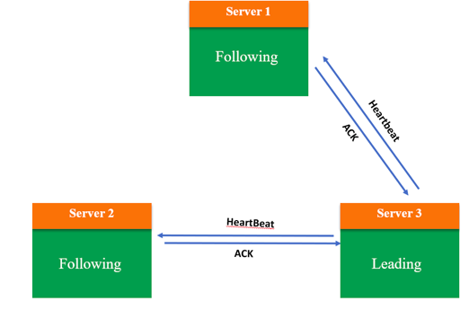 第三步:此时系统内所有服务器都推选了 Server 3,因此 Server 3 当选 Leader,处于Leading 状态,向其他服务器发送心跳包并维护连接;Server1 和 Server2 处于 Following 状态。