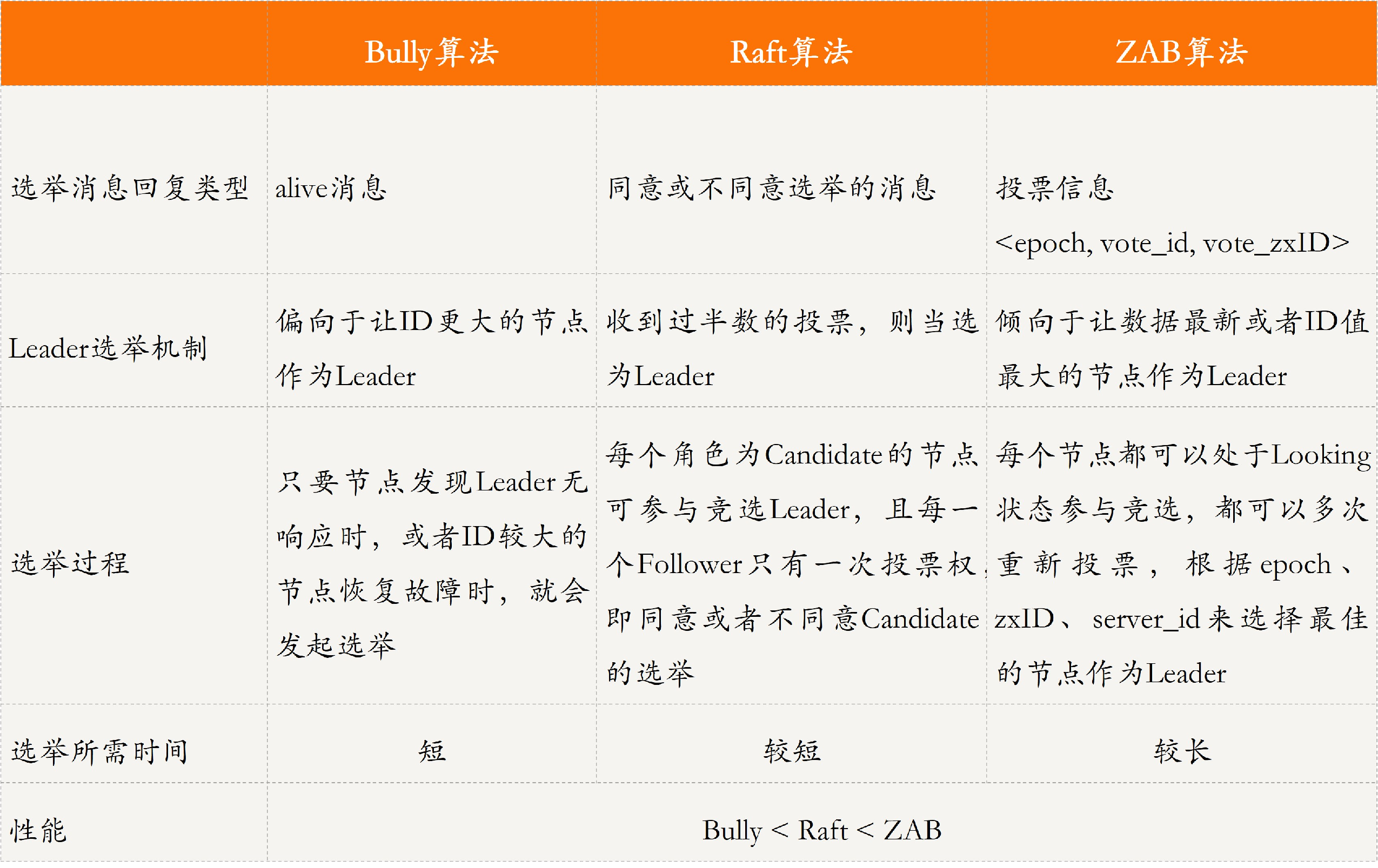 小结一下。ZAB 算法性能高,对系统无特殊要求,采用广播方式发送信息,若节点中有 n 个节点,每个节点同时广播,则集群中信息量为 n*(n-1) 个消息,容易出现广播风暴;且除了投票,还增加了对比节点 ID 和数据 ID,这就意味着还需要知道所有节点的 ID 和数据ID,所以选举时间相对较长。但该算法选举稳定性比较好,当有新节点加入或节点故障恢复后,会触发选主,但不一定会真正切主,除非新节点或故障后恢复的节点数据 ID 和节点ID 最大,且获得投票数过半,才会导致切主。