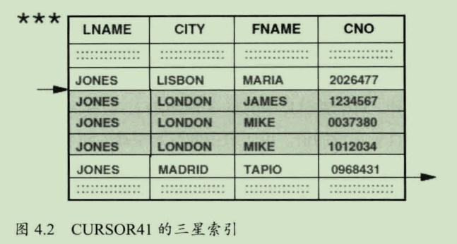 让我们尝试为这个 CURSOR 设计一个三星索引。大部分的推论与 CURSOR41 相同,但是“BETWEEN 谓词”将“=谓词”替代后将会有很大的影响。我们将会以相反的顺序依次考虑三颗星,按理说,这代表了理解的难度。